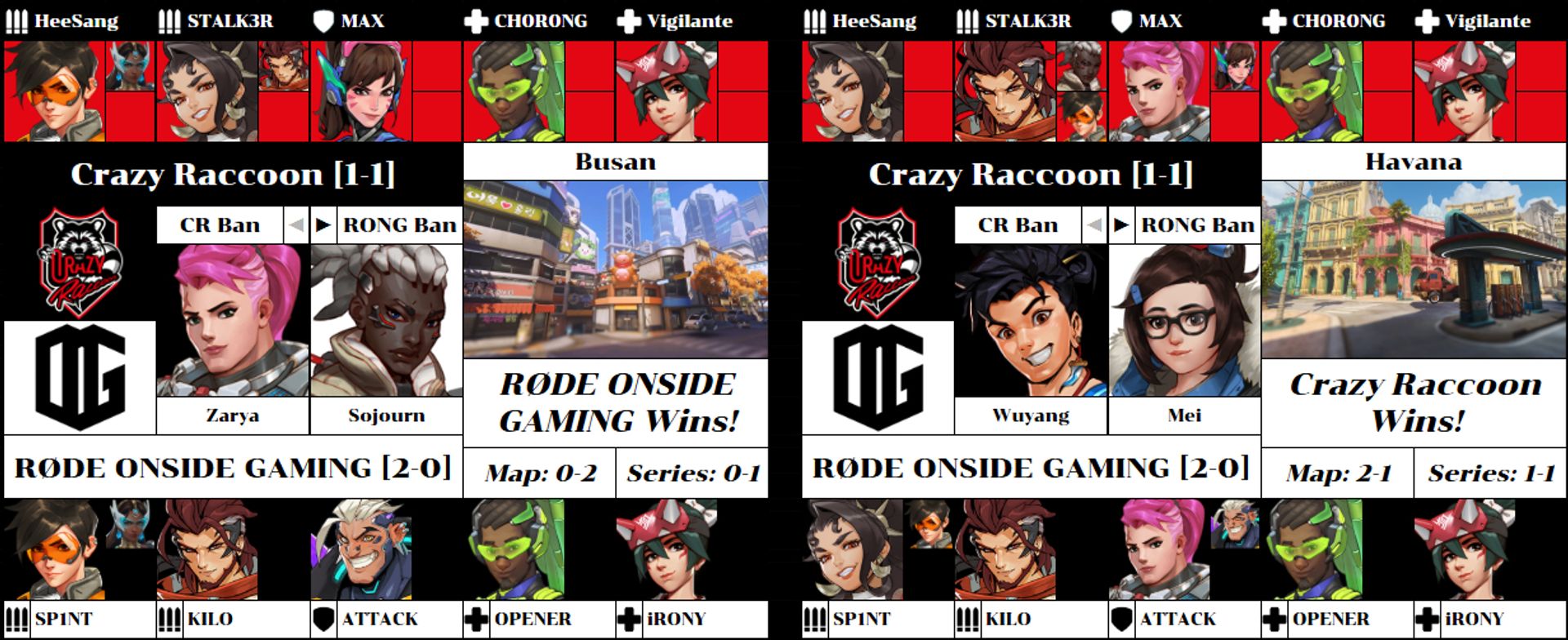 This series would end in Rialto, with RONG removing the Zarya, a mirror of CRâs initial ban on Busan. This map was nothing like Busan, with Crazy Raccoon jumping out with an overbearing offense, taking all three points with over two minutes left in the time bank. This aggressive strategy was spurred by the flexibility of Stalk3r and Chae "HeeSang" Hee-sang, who each played Vendetta, Mei, and Tracer and could swap between roles effortlessly. RONG came out blazing on their attack, trying to even up the map, but swaps onto Orisa and Echo from MAX and HeeSang led to CR holding them off, winning the map and the series. This matchup was a great showcase of these teams' strengths, and we expect to see these teams face off again in the playoffs.
