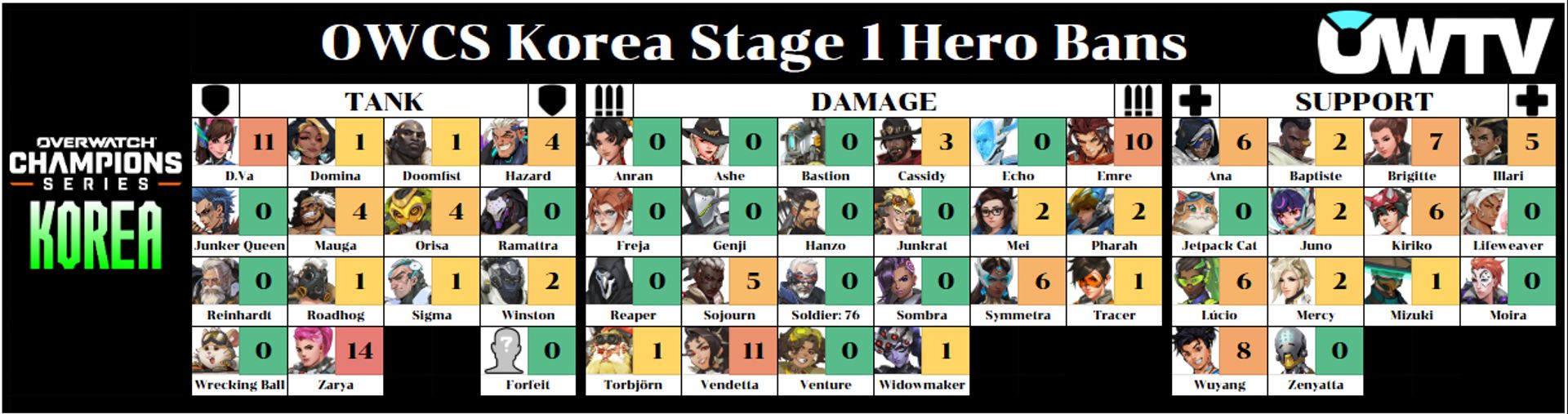 - Support is also by far the most diverse ban pool, with six heroes being banned more than 5 times (only two tanks and four DPS have that same metric).