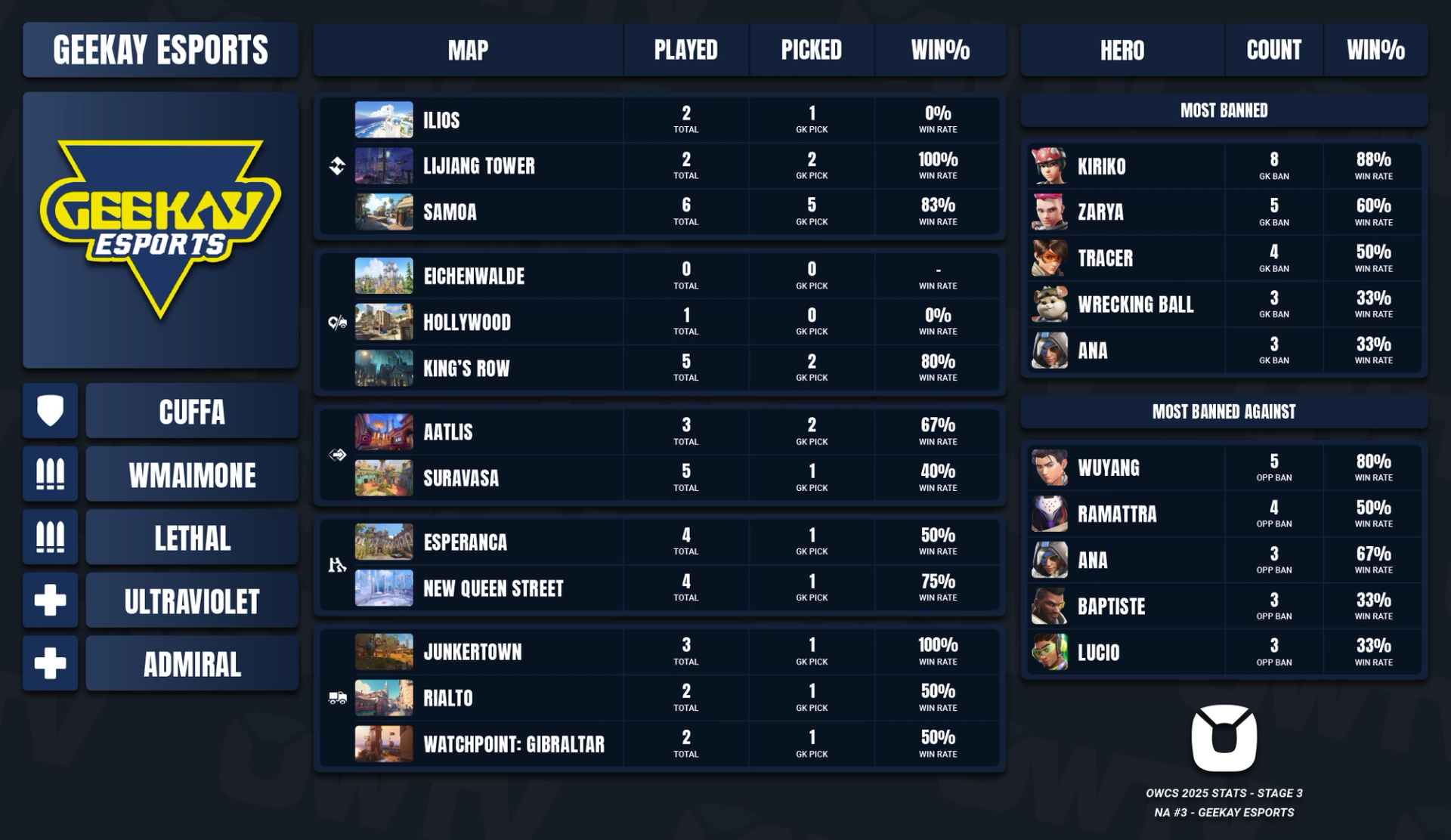 By the end of the Stage 3 Regional Finals, Liquid and Spacestation had played against Geekay for another combined 5 matches. Of those five games, however, Geekay went 1-4 in match victories and 10-14 in maps. This time, there would be no last-second comeback — Geekay placed 3rd, their worst performance of 2025.