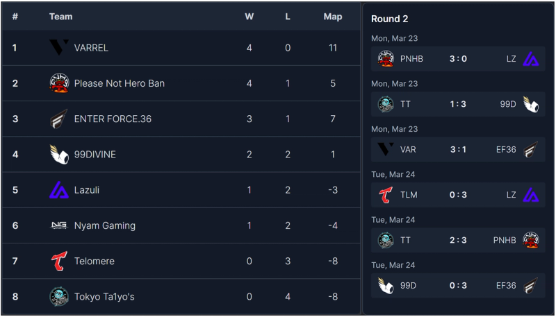 VARREL is steady in first, and they have already beaten the teams in second and third, so unless a generational collapse is in order, they will easily qualify for the playoffs. TOKYO TAIYOs is in the opposite situation, where they will almost certainly need to win out to get a chance at the playoffs. That being said, they only have E36, Lazuli, and Telomere left on the docket, so they have a chance to go 3-4 overall. The largest wildcard left is Nyam Gaming, which did not play this week. They are currently on the cusp of being eliminated, but they still have five games left to play, so they will shift in the standings.