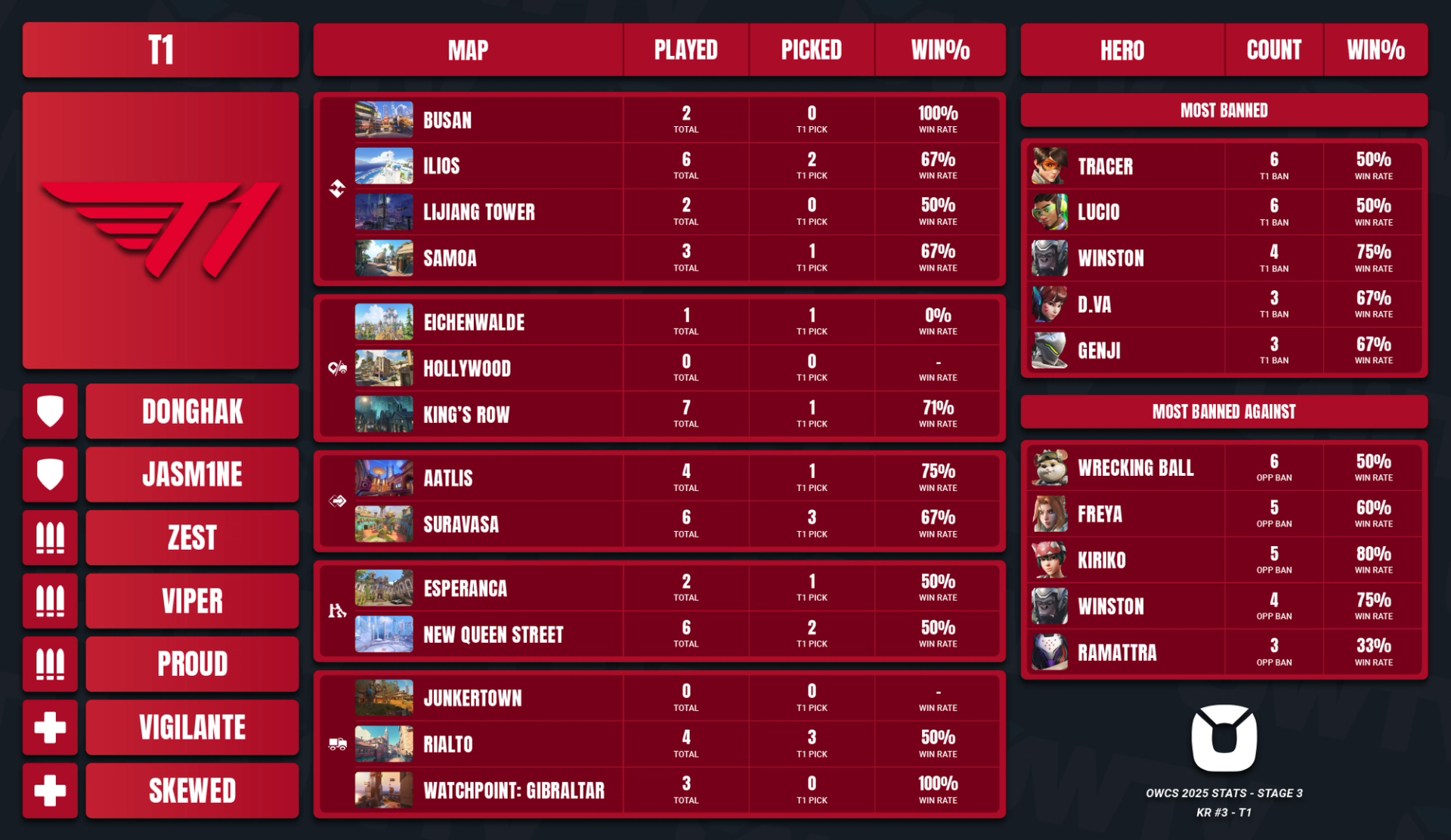 Impressively, they also won 71.43% of their King’s Row games, which is an important map to have in your pool, as it is picked extremely often. DONGHAK played Wrecking Ball for several of these wins as well, which makes it much more difficult to ban against T1 on this map.