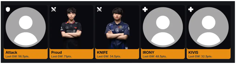 Last week, Shu (0.97 PCM) continued to disappoint, and M1nut2 (0.31 PCM) joined him in the disappointment fest, so weâve moved both of them out for Proud and Irony. Proud will be our main differential this week, with 11.7% ownership, giving us a chance to climb the leaderboard. Irony rounds out the roster nicely, and we managed to bring both of them in before the price rise, increasing our team value going into the playoffs.