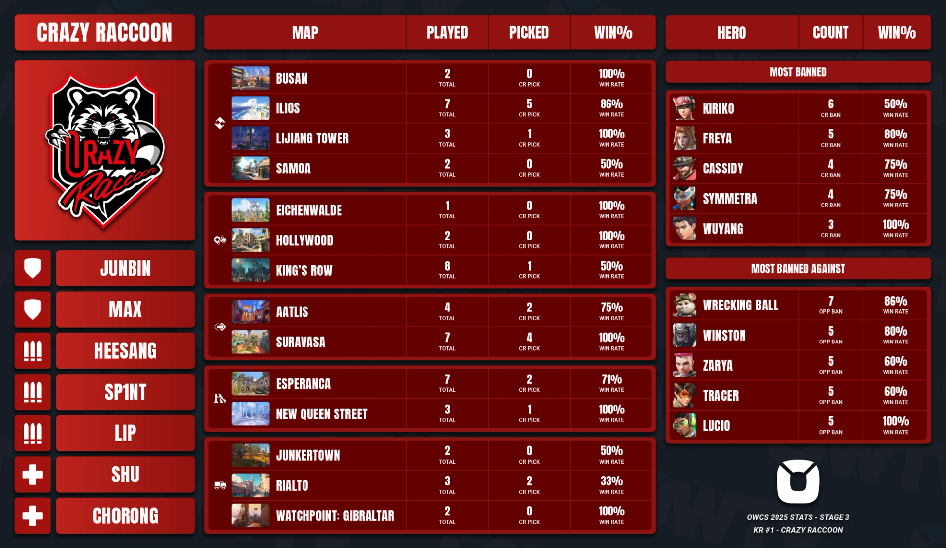 The most effective bans against Crazy Raccoon seem to be Tracer and Zarya. Keeping HeeSang and MAX away from their signature heroes kept Crazy Raccoon to a 60% win rate in both instances.